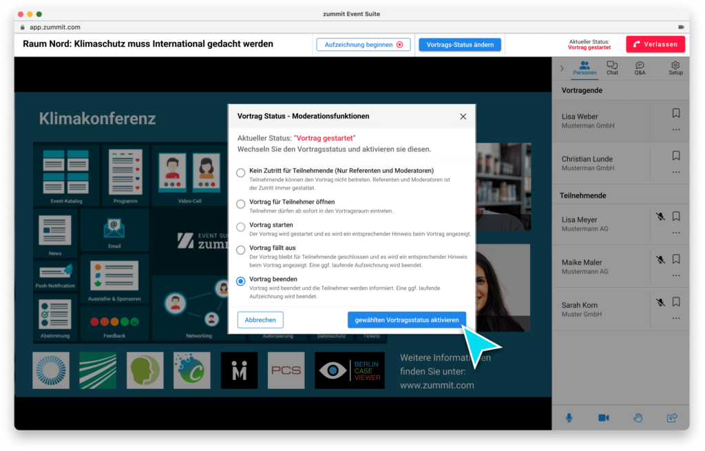 Der Vortrags-Status wird über die Schaltfläche Vortrags-Status ändern gesteuert und zeigt den Besuchenden immer genau an, ob der Vortrag noch nicht eröffnet, gestartet oder bereits beendet wurde.