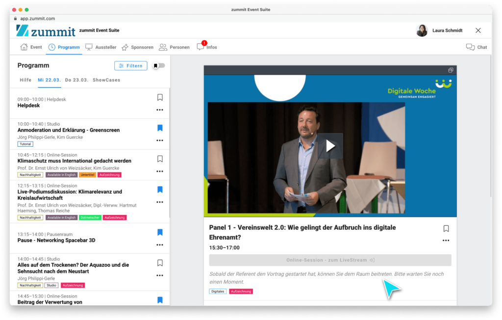 Insgesamt bietet unsere Funktion zur manuellen Eröffnung und Schließung von Livestreaming-Räumen Referierenden und Moderierenden die Kontrolle und Freiheit, die sie benötigen, um einen reibungslosen und professionellen Online-Vortrag zu halten. Behalten Sie die Regie über Ihren Vortrag und überzeugen Sie Ihr Publikum mit einem perfekt inszenierten Event! Probieren Sie es jetzt aus und erleben Sie selbst, wie einfach es sein kann, die Kontrolle über Ihren Vortrag zu behalten.